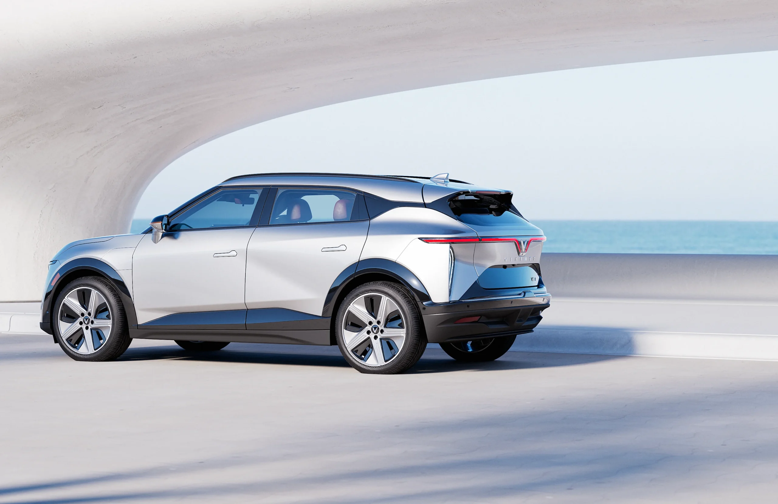 Desain eksterior VinFast VF 7 memancarkan kesan modern dan futuristik yang langsung menarik perhatian. Garis-garis bodi yang halus dan aerodinamis membantu mengurangi hambatan udara, meningkatkan efisiensi energi saat berkendara. Bagian depan mobil didominasi oleh grille minimalis dan lampu utama LED yang tajam, memberi kesan tegas dan elegan. Pada sisi samping, profil SUV ini tampak ramping dengan garis bahu yang tegas, menonjolkan kesan kekuatan dan kestabilan. Sementara itu, bagian belakangnya dilengkapi dengan lampu LED yang menyambung, menegaskan identitas visual yang konsisten dan futuristik. Pilihan warna eksterior yang beragam, mulai dari warna netral hingga warna cerah, memberi banyak opsi kepada konsumen untuk menyesuaikan dengan gaya pribadi mereka. Secara keseluruhan, desain VF 7 menampilkan perpaduan estetika modern dan aerodinamika yang mendukung performa sekaligus tampilan stylish.